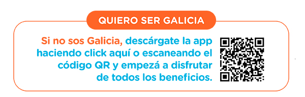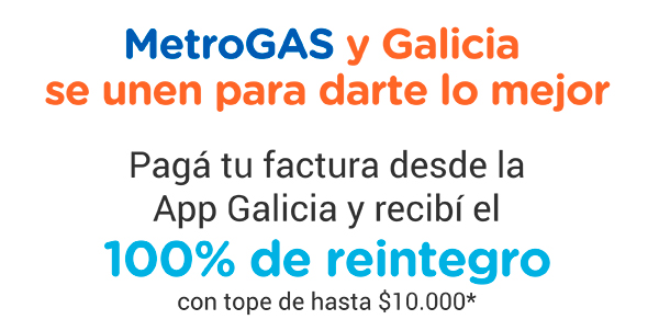 *Beneficio válido en zona de cobertura de MetroGAS S.A. desde el 01/12/2024 hasta el 31/12/2024 o hasta agotar el stock disponible de 10.000 reintegros otorgados, lo que ocurra primero. Promoción aplicable para pagos de facturas de Metrogas S.A. realizados a través de la App Galicia. Sólo válido para cartera de consumo para nuevos clientes Galicia Move (que no hayan tenido cuenta Galicia en los últimos 180 días y se den de alta a través del QR o link exhibido en esta comunicación), quienes deberán tener abierta una caja de ahorro común en el Banco Galicia, en la que se acreditará el monto del reintegro dentro de los 15 días hábiles posteriores a la finalización de la vigencia indicada. Obtendrán por única vez un reintegro del 100% del monto de la factura de MetroGAS S.A. que abonen, con tope de reintegro $10.000 por cliente. Beneficio no acumulable con otras promociones vigentes y no aplicable a pagos realizados a través de billeteras virtuales (excepto MODO), mPos y/o plataformas de pago online. PARA MÁS INFORMACIÓN Y CONDICIONES O LIMITACIONES APLICABLES, CONSULTE EN www.galicia.ar/personas/promo-metrogas. Banco de Galicia y Buenos Aires S.A.U., Tte. J.D. Perón 430, C.A.B.A., C.U.I.T. N° 30-50000173-5. MetroGAS S.A., G. Aráoz de Lamadrid 1360, C.A.B.A., C.U.I.T. N° 30-65786367-6.