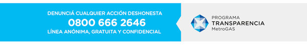 Ley 25.326 - Art. 14, inc. 3 - El titular de los datos personales tiene la facultad de ejercer el derecho de acceso a los mismos en forma gratuita a intervalos no inferiores a seis meses, salvo que se acredite un interés legítimo al efecto. Art. 27, inc. 3. El titular podrá en cualquier momento solicitar el retiro o bloqueo de su nombre de los bancos de datos a los que se refiere el presente artículo. Decreto 1558/01 - Anexo I - Art. 27, tercer párrafo. En toda comunicación con fines de publicidad que se realice por correo, teléfono, correo electrónico, internet u otro medio a distancia a conocer, se deberá indicar, en forma expresa y destacada, la posibilidad del titular del dato de solicitar el retiro o bloqueo, total o parcial, de su nombre de la base de datos. A pedido del interesado, se deberá informar el nombre del responsable o usuario del banco de datos que proveyó la información. Res. 14/2018 - Art. 3. La AGENCIA DE ACCESO A LA INFORMACIÓN PÚBLICA, en su carácter de órgano de Control de la Ley N° 25.326, tiene la atribución de atender las denuncias y reclamos que interpongan quienes resulten afectados en sus derechos por incumplimiento de las normas vigentes en materia de protección de datos personales. MetroGAS S.A., C.U.I.T. N° 30-65786367-6, domicilio G. Aráoz de Lamadrid 1.360, C.A.B.A. Si ya no deseás recibir más información vía correo electrónico hacé clic acá: Cancelar suscripción. Más información en www.metrogas.com.ar. Por favor, no respondas a este mensaje, es un envío automático